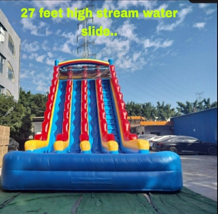 Towering at 27 feet, this triple‑lane inflatable slide turns any backyard, block party, or event into a pulse‑quickening racecourse. Three parallel lanes give friends and family side‑by‑side thrills: climbers ascend the central ladder, pick a lane, then drop down a steep, fast chute that ends in a cushioned inflatable runout for a safe finish. Bright, bold colors and high side walls keep riders in their lanes while the deep landing pad cushions every splash or rollout.